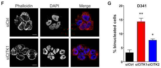 To investigate whether CITK could be a potential target for Group 3 and Group 4 (G3/G4) medulloblastoma (MB), we resorted to the established human medulloblastoma cell lines D283 (p53 wt, no myc amplification) and D341 (p53 wt, myc amplification) [32]. Transient transfection of validated siRNAs (siCITK1 and siCITK2) [31] was effective in downregulating CITK protein levels in both cell lines, as assessed by Western blot, after 72 h (Figure 1A). In the D283 line, cell expansion was significantly reduced by CITK downregulation after 100, 150 and 200 h from transfection (Figure 1B). A similar effect was observed in D341 cells, although in this case, the kinetic of proliferative impairment was faster than in the D283 line (Figure 1C). Western blot analysis revealed that CITK levels were still suppressed by both siRNAs after 200 h for D283 and 144 h for D341 (Figure S1A). Since cytokinesis failure is the most knowneffect of CITK loss in both sensitive normal tissues and tumor cells [28,33], we investigated whether this phenotype also occurs in G3/G4 MB cell lines. As shown in Figure 1D,G, CITK downregulation significantly increased the percentage of D283 and D341 cells with two nuclei, 100 and 72 h after transfection, respectively. On average, the integrated DAPI intensity in binucleated cells was double than in mononucleated cells (Figure S1B), highlighting a failure in mitosis after anaphase.