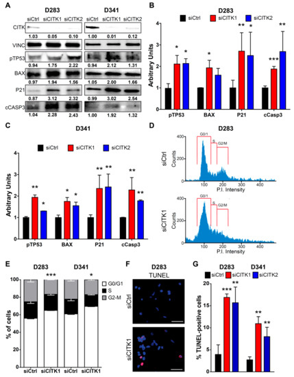 Besides cytokinesis failure, it has previously been reported that CITK loss leads to apoptosis via TP53 [16,31,33]. We therefore tested whether these events are also induced in G3/G4 cell lines. Both D283 and D341 CITK-depleted cells showed increased levels of phospho-TP53, as well as of the TP53 targets BAX and P21 (Figure 2A–C and Figure S2). Flow-cytometry analysis revealed that, in both lines, CITK depletion leads to a significant increase of cells in the G0/G1 phase and a reduction of the G2/M peak (Figure 2D,E), indicating a strong inhibition of cell-cycle progression. The proliferative block may justify a reduction of the G2/M in spite of an increased proportion of binucleated cells, as detected by IF (Figure 1D–G). Ultimately, D283 and D341 showed increased levels of apoptosis, as indicated by increased percentage of cells positive for TUNEL (Figure 2F,G) and cleaved Caspase 3 (Figure S2 and [34]), as well as by increased total levels of cleaved Caspase 3 (Figure 2A–C).