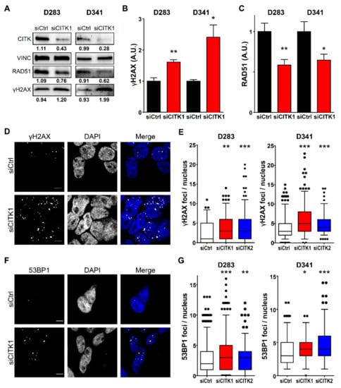 In previous studies, we showed that CITK knockdown primarily leads to accumulation of DNA double strand breaks (DSB) in neural progenitors and HeLa cells, both in vivo and in vitro [16,31]. We therefore asked whether markers of DNA damage are also altered in G3/G4 MB cells. CITK knockdown induced a significant increase of γH2AX levels (Figure 3A–C), as well as of γH2AX nuclear foci (Figure 3D,E), which are indicative of increased DNA damage. Interestingly, these cells exhibit a parallel decrease of the DNA repair protein RAD51 (Figure 3A,C). In addition, we observed a significant increase in the frequency of nuclear foci positive for 53BP1 (Figure 3F,G), indicating that many of the DNA lesions induced by CITK loss were DSBs [35,36]. Accumulation of 53BP1 foci 48 h after CITK knockdown was also observed in ONS-76 and DAOY cells (Figure S3A,B), in which γH2AX activation was previously demonstrated [31]. The latter result indicates that DSBs accumulation is a common consequence of CITK loss in MB cells, which may be followed by apoptosis or cell-cycle arrest.