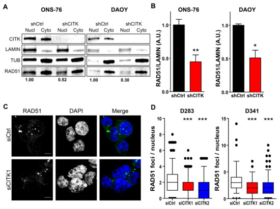 RAD51 is a crucial player in homologous recombination (HR)-dependent DSB repair [37]. The finding of reduced total levels of this protein suggests that DSB accumulation detected in MB cells could be caused by reduced efficiency of HR-dependent repair pathway. Since RAD51 operates in the nuclear compartment and its loss induces DNA damage and radiosensitization [38], we set out to evaluate nuclear RAD51 levels in CITK-depleted MB cells. To this aim, we resorted to ONS-76 and DAOY, which we previously engineered for conditionally expressing CITK-specific shRNAs [31]. In these cells, profound CITK depletion can be induced and maintained more efficiently than after transient transfection of siRNAs (Figure S3C), thus simplifying the cell fractionation protocol. Even in this case, we found that RAD51 total levels are reduced after CITK loss, although to a lesser extent if compared with D283 and D341 cells (Figure S3D,E). Nevertheless, in both cell lines, nuclear RAD51 were strongly reduced (Figure 4A,B). In particular, the reduction was around 60% for ONS-76 shCITK and 50% for DAOY shCITK (Figure 4B,D). To consolidate this finding on G3/G4 MB cell lines, we evaluated the frequency of nuclear RAD51 accumulations by immunofluorescence analysis, which was significantly reduced in both cell types (Figure 4C,D).
