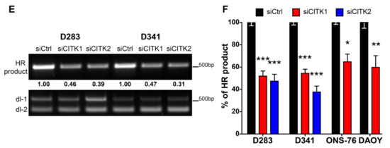 To analyze homologous recombination after CITK knockdown, a Homologous Recombination Assay Kit (Cat. 35600, Norgen Biotek Corporation, Thorold, ON, Canada) was used, following manufacturer instructions. Briefly, 100,000 D283 cells and 50,000 D341 cells were plated in 24-well plates and transfected with siCtrl, siCITK 1 and siCITK2 for 72 h. Then, 50,000 ONS-76 and DAOY cells were instead plated in 24-well plates and transfected with siCtrl and siCITK1 for 48 h. After CITK knockdown, cells were transfected with 0.5 ug of dl plasmids (dl-1 and dl-2). After 24 h, plasmid DNA was isolated, quantified and 0.5 ng of DNA plasmid from each condition was amplified with PCR (initial denaturation at 95 °C for 3 min, and then 95 °C for 15 s, 61 °C for 15 s and 72 °C for 15 s, and repeated for 33 cycles, and then a final extension at 72 °C for 5 min).