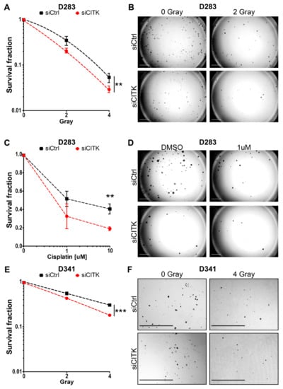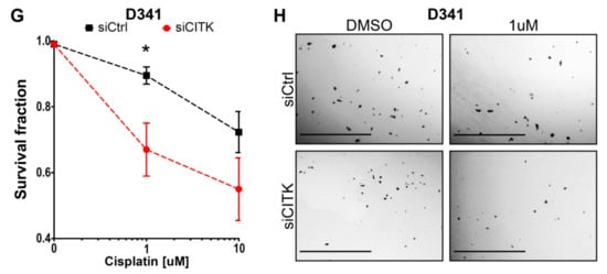 In all experiments, the different conditions (e.g., radiation dose and cisplatin treatment) were compared to the correspondent siCtrl or siCITK without treatment.