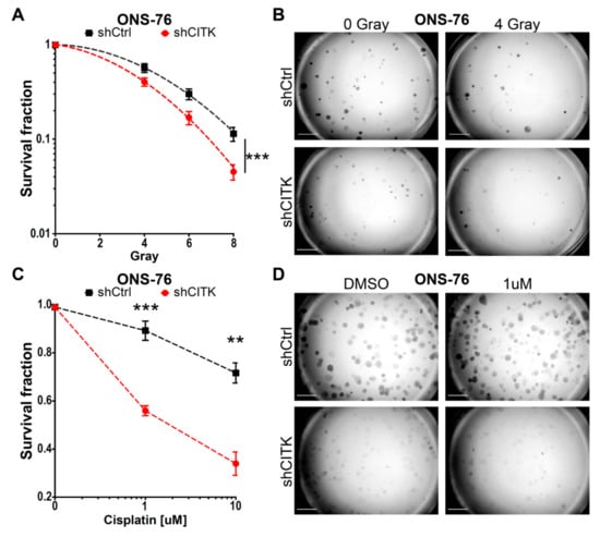 For all MB lines, we tested different IR doses, to assess the best window for detecting combined effects in clonogenic assays. As reported in the literature, D283 and D341 are more sensitive to radiation treatment compared to ONS-76 and DAOY [45,46,47]. We selected 2 and 4 Grays (Gy) dosage for the first two cell lines, because no colonies were detectable at higher doses in CITK-depleted cells. Based on similar considerations, 4, 6 and 8 Gy were used for ONS-76 and DAOY cells. Likewise, we set out to treat all MB cells only with 1 and 10 µM of cisplatin for 1 hour, since not many colonies were formed at higher concentrations.