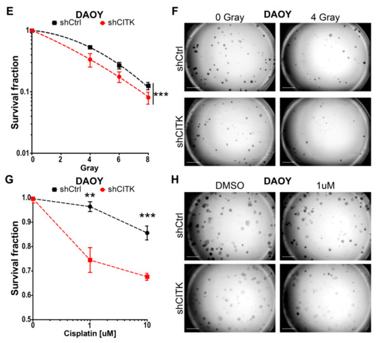 Then, 10,000 D341 cells transfected with siCtrl or siCITK for 72 h, were treated with cisplatin at 1 and 10 μM concentration for 1 h, centrifugated at 150 g for 5 min and then plated for colony forming assay. For D283, 6000 cells were plated and transfected with siCtrl or siCITK for 72 h, and then cisplatin was added at 1 and 10 μM concentration for 1 h. After treatment, cells were washed 2 times with PBS, and fresh medium was added to allow colony growth. For ONS-76 and DAOY, 500 cells were plated in doxycycline containing medium, for 48 h, and then the cells were treated with cisplatin, similarly to D283 cell line.