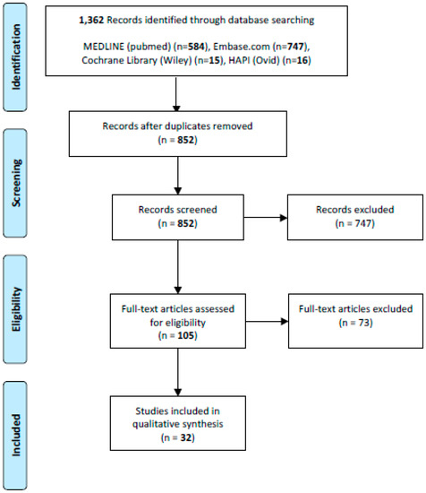 Two reviewers independently reviewed 850 abstracts after removal of duplicates and 105 full texts. Clinical studies describing QOL outcomes after surgical treatment of extremity lymphedema with either LVB or VLNT, with a minimum sample size of four patients and written in English were included in our study. Non-referenced articles, case reports, review articles and non-human articles were excluded. A total of 32 studies matched inclusion criteria (Figure 1).