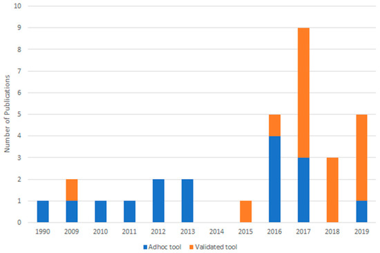 Publications with ad-hoc versus validated tools over time.
