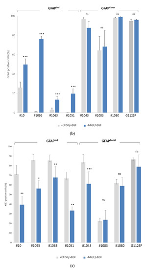 A panel of human GSCs used in this study was isolated from newly diagnosed GBs and characterized for neural lineage markers and stem cell markers in our previous studies [19,20,21,22,23]. In brief, the abundant expression of the neural stem/progenitor cell marker nestin is a common characteristic of all GSCs analyzed in this study (Table S1). In contrast, an astrocyte marker glial fibrillary acidic protein (GFAP) shows variable expression patterns in different lines and under different culture conditions (Figure S1). Considering that GFAP is a phenotypic marker of astrocyte differentiation, the heterogeneity of GFAP phenotypes suggest varying degrees of the differentiation capacity. To test this assumption, we estimated the proportion of GFAP positive cells in relation to differentiation. To visualize morphological changes, a hallmark of cell differentiation, GSCs were analyzed by immunocytochemical staining as illustrated in Figure 1a. The results obtained for different lines are summarized in Figure 1b and show that an exposure to differentiation-inducing condition (bFGF and EGF withdrawal) leads to a significant increase in the proportion of GFAP-expressing cells in some (but not all) GSCs (Figure 1b), concomitantly with the acquisition of morphology characteristic of differentiated cells (Figure 1a and Figure S1a).