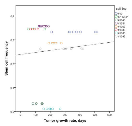 Lack of correlation between the frequency of self-renewing cells and rate of tumor growth driven by GSCs. Circles correspond to the time to individual mice death from a GSC-induced brain tumor. Different GSCs lines are color-coded. Pearson correlation analysis (r = 0.074, p = 0.60). Dotted line corresponds to the trend line.
