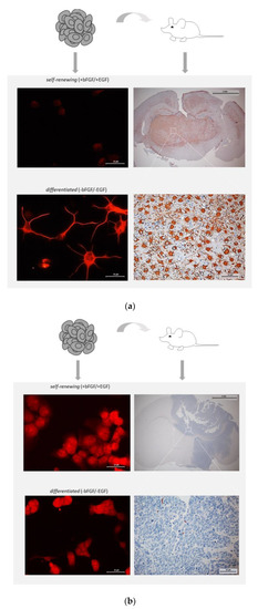 - Barrett, L.E.; Granot, Z.; Coker, C.; Iavarone, A.; Hambardzumyan, D.; Holland, E.C.; Nam, H.S.; Benezra, R. Self-renewal does not predict tumor growth potential in mouse models of high-grade glioma. Cancer Cell 2012, 21, 11–24. [Google Scholar] [CrossRef] [PubMed]