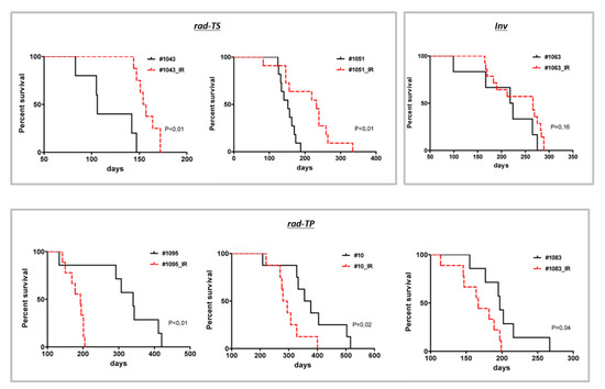 We next sought to evaluate the consequences of fractionated radiation (fr-IR) to the tumor-propagating capacity and proliferative potential of GSCs. Tumor-matched non-radiated GSC and their fr-IR treated counterparts (designated as “GSC_IR”) were compared as depicted in Figure S4. Comparative survival analyses revealed that fr-IR treatment leads to non-uniform changes in the tumor-propagating capacity (TPC) in different GSCs showing either a reduction, augmentation or no change in the degree of tumorigenicity after radiation (Figure 4). According to the type of change in TPC after fr-IR, GSCs were designated as rad-TS (radiation-associated tumor suppression), rad-TP (radiation-associated tumor promotion), or Inv (invariable).