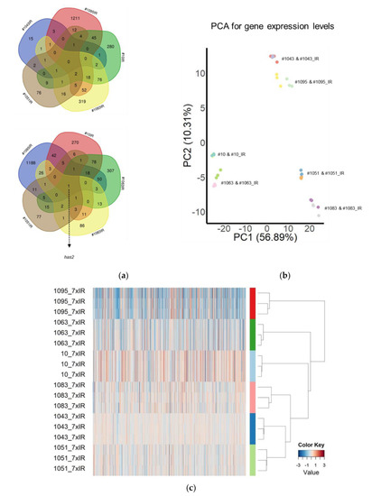 Diverse patterns of transcriptomic changes induced by hypofractionated radiation. (a) Venn diagram showing the overlap in differentially expressed genes (DEGs) identified in different GSC/GSC_IR pairs; (b) Principal component analysis of gene expression compared between isogenic GSC and GSC_IRs. Each line was analyzed in triplicate. Values aligned with axes show proportion of variance in percent for principal components 1 (PC1) and 2 (PC2), respectively; (c) Heatmap for log2 fold change (FC) of gene expression levels calculated for 1989 significantly altered genes (FDR < 0.05, log2(FC) ≥ 1).