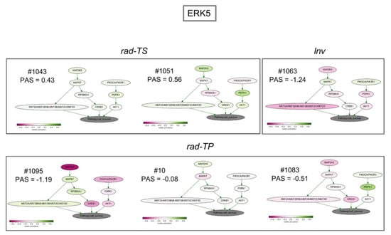 There was a striking concordance between the direction of change (up or down) in the three pathways, their biological functions, and experimentally determined outcomes after fr-IR treatment. The non-uniformity of radiation-induced changes in Erk5 and TGF-beta pathways is especially intriguing considering that these pathways have important roles in gliomas and glioma stem cells with Erk5 being a promoter of neural differentiation [26,27,28,29] and TGF-beta a major glioma pathway [30,31,32]. Of special interest is the finding of an inverse correlation between radiation-induced changes in the tumor-propagating potential of GSCs and changes in Erk5 pathway activity: While augmented in radiosensitive GSCs (pattern rad-TS) Erk5 pathway was inhibited in radioresistant GSCs (patterns rad-TP and Inv) (Figure 7). Considering essential roles of Erk5 pathway in promoting neural differentiation this suggests an association between radiation impacts on GSCs ability to differentiate and tumorigenicity changes in radiated GSCs. Parallel changes in Erk5, TGF-beta and apoptotic pathways imply that the ultimate fate of radiated GSCs is determined by cumulative impacts of radiation on signaling pathways involved in the regulation of cell death, differentiation and proliferation.