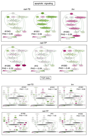 To analyze transcriptomic patterns at the level of signaling pathways, we applied Oncobox, a bioinformatic method that enables to quantitatively estimate pathways activities calculated from expression levels of genes relevant for a particular pathway and expressed in so-called pathway activation level scores (PAL/PAS) [25]. PAL scoring conducted for 3125 pathways from the Oncobox database [25] revealed oncopathways affected by fr-IR in different GSCs (Table S3). In all GSCs/GSC_IR pairs analyzed, Erk5, TGF-beta and mitochondrial apoptosis pathway were most significantly different between non-radiated and radiated GSCs (Figure 7).