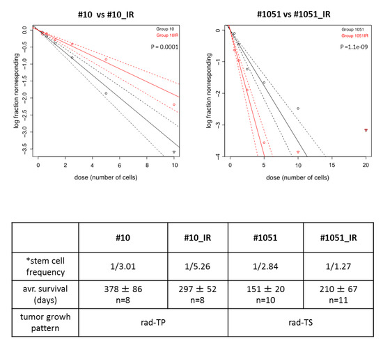 Comparative assessments of self-renewal in non-radiated and radiated GSCs by ELDA. Upper panels show the results for #10/#10_IR or #1051/#1051_IR pairs from three independent experiments. Table shows average frequency of stem cells (*) determined in three independent experiments. Also shown are average survival time of mice implanted with corresponding GSCs and tumor growth pattern after radiation.