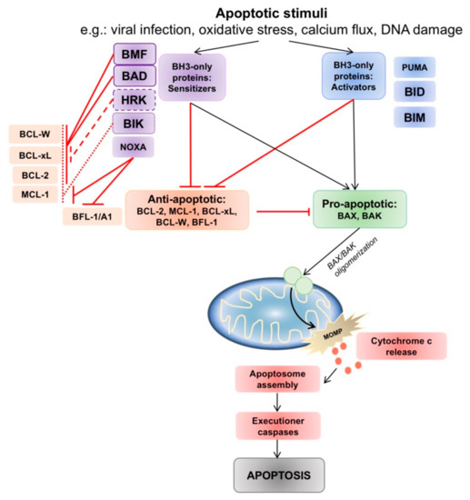 The BCL-2 family members are central regulatory players in the intrinsic mitochondrial apoptotic program, and their interplay controls cell fate [12] (Figure 1). More than 25 BCL-2 family members have been identified. Advances in structural resolution of these members have categorized them into three subfamilies—(1) the multidomain anti-apoptotic members (BCL-2, BCL-xL, MCL-1, BCL-w, BCL-B/Boo and BFL-1/A1), (2) the multidomain pro-apoptotic members (BAX, BAK), and (3) the BH3-only members (BAD, BID, NOXA, HRK, BMF, PUMA, BIM). Multi-domain members in (1) and (2) have four BCL-2 homology (BH) domains (BH1, BH2, BH3 and BH4) each, while the BH3-only members are comprised of only a single short BH3 domain [13,14,15]. The BH3 motif is composed of 9 to 15 amino acids and is uniquely conserved across all BCL-2 family members [16]. BH3 interactions are responsible for orchestrating the BCL-2 interactome via a BH3-into-hydrophobic groove mechanism [17,18], which allows the formation of homo- and heterodimers that control apoptotic function [19]. Minor alterations in the amino acid sequences of the binding grooves and BH3 domains control the specificity of these interactions.