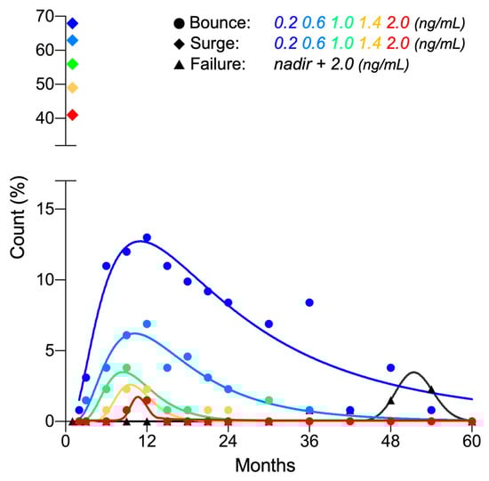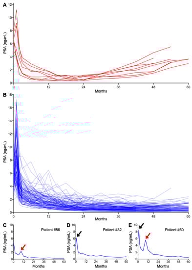 Post-CIRT PSA kinetics for all patients are summarized in Figure 1A,B. Eight patients experienced PSA failure (Figure 1A). In PSA failure-free patients (Figure 1B), the patterns of temporary increase in PSA could be classified into two distinct groups in terms of the timing of occurrence and amplitude, namely one that is classically known as the PSA bounce (Figure 1C,E) and the other being a sharp rise in PSA at one month post-CIRT (Figure 1D,E). The latter phenomenon has not been reported previously; therefore, we refer to this hereafter as the PSA surge.