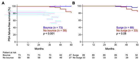 Kaplan–Meier estimates of PSA failure-free survival. (A) PSA bounce-positive vs. -negative patients. (B) PSA surge-positive vs. -negative patients. Cutoff, 0.2 ng/mL. p-values were determined by log-rank test.