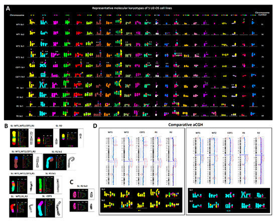 To address the flexibility of the complex ALT genome, and to unravel patterns of cancer genome evolution driven by oncogene induced replication stress, telomere dysfunction, or genotoxic damage, we examined five isogenic cell lines of the human ALT osteosarcoma cell line U2-OS, representing different karyotypic outcomes, using M-FISH/ (Multi-Color Fluorescent In Situ Hybridization) molecular karyotyping, combined with inverted DAPI banding and aCGH (array-Comparative Genomic Hybridization). Our U2-OS cell line panel included two independently obtained unperturbed (wild-type) cells (wt1 and wt2) [43], two isogenic chemo-resistant wt2-derived cell lines (R1 and R2) [44], and another wt2-derivative cell line that stably overexpresses the replication licensing factor CDT1 [45]. The five U2-OS cell lines displayed similar numerical chromosomal constitution, with predominant peri-triploid subclones composed of 69–80 chromosomes. In addition, they all exerted similar heteroploidy rates, with co-dividing, endoreduplicated populations of 115–136 chromosomes, ranging from 10% to 20% of the metaphase spreads. Based on the presence or absence of specific clonal structural chromosome rearrangements, we identified at least two karyotypically distinct, major subclones per independent U2-OS-derivative cell line (Figure 1A and Figures S1–S6). Although diverse, all 10 representative U2-OS karyotypes shared at least six identical structural chromosome rearrangements, confirming monoclonal origin from a single progenitor genome. At least four events of the U2-OS chromosomal evolution coincided with karyotypes bearing multiple duplicated copies of clonal recombinant chromosomes, suggesting that polyploidization and polyploidy reduction are frequent events during ALT tumor clonal evolution in culture. The U2-OS karyotype was shaped by whole or partial chromosome gains or losses and by novel clonal structural rearrangements such as unbalanced translocations, deletions, or multicentric chromosome formations. While clonal evidence of chromoanagenesis [46] was rare by M-FISH, specific recombinant chromosomes or segments displayed a tendency to persist in the evolving karyotype, even after breakage and rejoining into novel marker chromosomes (Figure 1A–C). Since these jumping recombinant DNA segments were present in all karyotypically different U2-OS cell lines, we presumed that they may confer critical genome imbalances supporting continuous cellular growth. We tested this hypothesis by aCGH. Despite the karyotypic diversity, all five U2-OS cell lines shared a plethora of large identical duplications/deletions (Figure 1D and Figures S1–S6). These observations reveal a limited karyotypic flexibility of the highly unstable ALT genome, suggesting a trend of the dividing cancer cells to maintain specific dosage imbalances, despite the elevated recombination rates generated by increased breakage and illegitimate chromosome rejoining.
