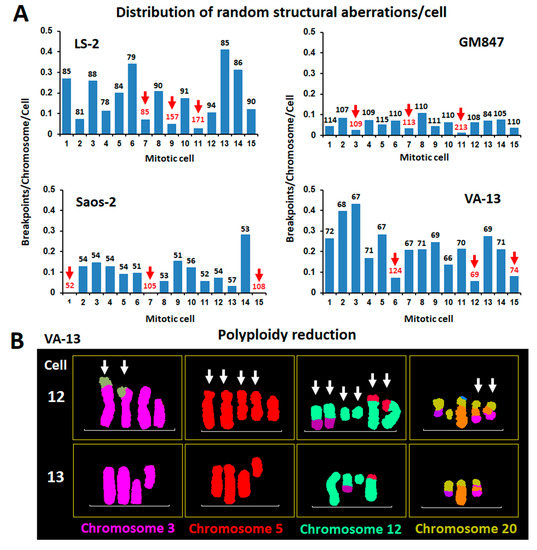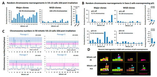 The following are available online at https://www.mdpi.com/2072-6694/12/3/591/s1, Figures S1–S6: Comparison of aCGH with M-FISH in 5 U2-OS cell lines. Figure S7: Random chromosome rearrangements in 15 LS-2 cells. Figure S8: Random chromosome rearrangements in 15 Saos-2 cells. Figure S9: Random chromosome rearrangements in 15 GM-847-2 cells. Figure S10: Random chromosome rearrangements in 15 VA-13 cells. Figure S11: Random chromosome rearrangements in irradiated VA-13 cells: major subclones. Figure S12: Random chromosome rearrangements in irradiated VA-13 cells: WGD subclones. Figure S13: Random chromosome rearrangements in control Saos2 cells. Figure S14: Random chromosome rearrangements in survivors of p21 overexpression. Figure S15: Chromosome numbers in 50 VA-13 cells after irradiation.