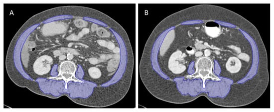 The change of skeletal muscle area (outlined in blue) on computed tomography (CT) images at the L3 vertebral level at the baseline (A) and after chemoradiation therapy (B) from one patient. Images were taken 5 months apart. At the time point of pre-treatment CT, the body mass index (BMI) and skeletal muscle index (SMI) were 24.1 kg/m2 and 51.8 cm2/m2, respectively. At the time point of post-treatment CT, the BMI and SMI were 25.4 kg/m2 and 47.3 cm2/m2, respectively.