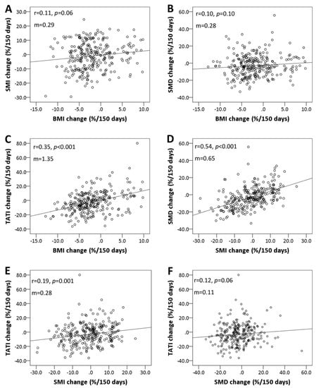 Scatter plots showing correlations between the changes in BMI, SMI, skeletal muscle density (SMD), and total adipose tissue index (TATI): (A) SMI vs. BMI, (B) SMD vs. BMI, (C) TATI vs. BMI, (D) SMD vs. SMI, (E) TATI vs. SMI, and (F) TATI vs. SMD. Spearman’s rank correlation coefficient (rho) was used to assess correlations between body composition parameters. Slopes (m) for the correlations are shown on each graph.