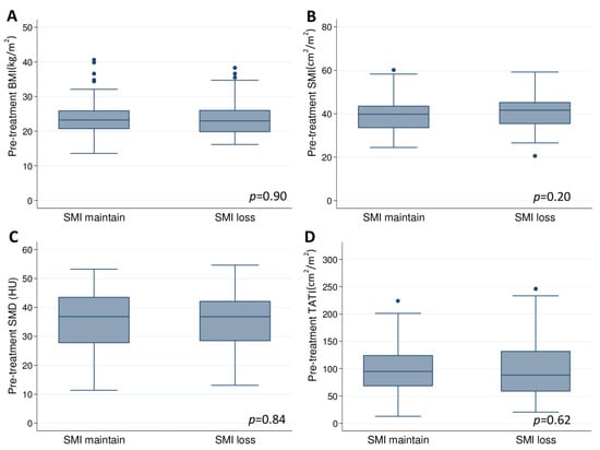 The cut-off values for body compositions were as follows: sarcopenia: SMI < 36.3 cm2/m2; myosteatosis: SMD < 30.7 HU; and low TATI: TATI < 112.2 cm2/m2. Pre-treatment BMI, SMI, SMD, and TATI were similar for the SMI loss and SMI maintained groups (Figure 3; Supplementary Table S1). The frequency of sarcopenia before CCRT was similar for SMI loss and SMI maintained groups (28.9% vs. 35.1%; p = 0.30). After CCRT, the frequency of sarcopenia was significantly higher in the SMI loss group than in the SMI maintained group (48.9% vs. 28.2%; p = 0.001). Pre-treatment myosteatosis was present in 31 (34.4%) patients in the SMI loss group compared with 61 (32.4%) patients in the SMI maintained group (p = 0.74). Pre-treatment low TATI was present in 57 (63.3%) patients in the SMI loss group compared with 129 (68.6%) patients in the SMI maintained group (p = 0.38).