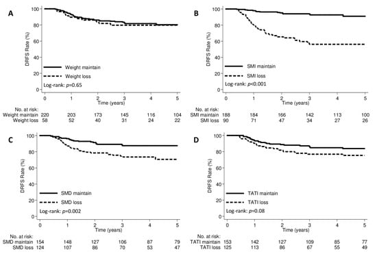 Kaplan–Meier curve demonstrating distant recurrence-free survival according to (A) weight change, (B) SMI change, (C) SMD change, and (D) TATI change groups. DRFS, distant recurrence-free survival; SMD, skeletal muscle density; SMI, skeletal muscle index; TATI, total adipose tissue index.