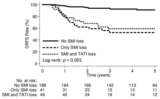 Kaplan–Meier curve demonstrating distant recurrence-free survival in patients with “No SMI loss”, “Only SMI loss”, and “SMI and TATI losses”.