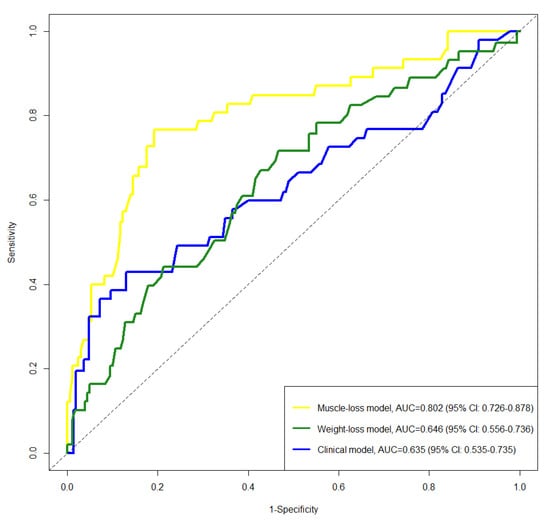 To evaluate the benefit of incorporating CT-based muscle measurements for predicting distant failures, we constructed DRFS models incorporating muscle or weight change and other clinical prognostic variables and determined the C-index, receiver operating characteristic (ROC) curves, and area under the curve (AUC). The clinical model included the FIGO stage, PLN status, pathology, and SCC-Ag; the weight-loss model added weight change to the clinical model; and the muscle-loss model added muscle change to the clinical model. The C-indexes of the constructed models showed similar indexes for the clinical model (0.756 [95% CI: 0.679–0.832]) and the weight-loss model (0.758 [95% CI: 0.680–0.836]), p < 0.06, while that of the muscle-loss model (0.824 [95% CI: 0.748–0.900]) was greater than that of the clinical model (p < 0.001) and weight-loss model (p < 0.001). Figure 6 shows the time-dependent ROC curves for 3-year DRFS for the three models. The muscle-loss model achieved the highest area under the curve for 3-year DRFS prediction (0.635, 0.646, and 0.802 for the clinical model, the weight-loss model, and the muscle-loss model, respectively).