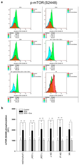 Phospho-flow analysis of mTOR S2448 in a panel of primary lymphocyte subsets. (a) Representative experiments conducted on peripheral blood samples obtained from patients with SDS. Red histograms represent age-matched healthy control cells; green histograms represent SDS lymphocytes; blue histograms represent SDS lymphocytes upon everolimus (350 nM) treatment. (b) Data are mean ± SEM of seven experiments conducted on SDS lymphocytes obtained from seven SDS patients (UPN37, UPN58, UPN69, UPN73, UPN87, UPN106, UPN108). Statistics: normal distribution was tested by the Shapiro–Wilk test. Subsequently, the Mann–Whitney Rank Sum Test was calculated. * p < 0.05; ** p < 0.01.
