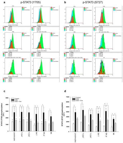 Phospho-flow analysis of STAT3 in a panel of primary lymphocyte subsets. (a) Representative analysis of phospho-STAT3 Y705 in lymphocyte subsets. (b) Representative analysis of phospho-STAT3 S727 in lymphocyte subsets. Red histograms represent age-matched healthy control cells; green histograms represent SDS patient-derived lymphocytes; blue histograms represent SDS lymphocytes upon everolimus (350nM) treatment. Data are mean ± SEM of seven experiments conducted on SDS patient-derived lymphocytes obtained from seven SDS patients (UPN37, UPN58, UPN69, UPN73, UPN87, UPN106, UPN108). Statistical Student’s t test for paired data has been calculated. * p < 0.05; ** p < 0.01. (c) STAT3 (Y705) Median Fluorescence Intensity as measured by phospho-flow assays. (d) STAT3 (S727) Median Fluorescence Intensity as measured by phospho-flow assays. Data are mean ± SEM of seven experiments conducted on SDS lymphocytes obtained from seven SDS patients (UPN37, UPN58, UPN69, UPN73, UPN87, UPN106, UPN108). Statistics: Normal distribution was tested by the Shapiro–Wilk test. Subsequently, the Mann–Whitney Rank Sum Test was calculated. * p < 0.05; ** p < 0.01.