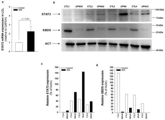 STAT3 transcript and protein expression is upregulated in SDS patient-derived LCL. (a) STAT3 mRNA expression in LCL isolated from UPN6, UPN43, UPN58, UPN82 (black bar), and from age-matched controls (white bar), measured by qRT-PCR. Data are mean ± SEM of four experiments performed in duplicate. (b) STAT3 protein level was measured in LCL (UPN6, UPN43, UPN58, UPN82) by Western blot analysis. (c,d) Densitometric analysis of Western blots showed in panel (b). Statistics: Normal distribution was tested by the Shapiro–Wilk test. Subsequently, the Mann–Whitney Rank Sum Test was calculated and reported within histograms.