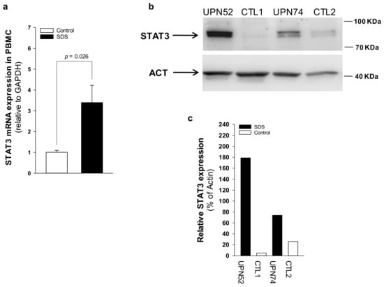 STAT3 transcript and protein expression is upregulated in SDS patient-derived primary PBMC. (a) STAT3 mRNA expression in primary PBMC isolated from UPN26, UPN69, UPN73, UPN87, UPN94, UPN106, and UPN108 (black bar), and from age-matched controls (white bar), measured by qRT-PCR. Data are mean ± SEM of seven experiments. (b) STAT3 protein level was measured in PBMC (UPN52 and UPN74) by Western blot analysis. (c) Densitometric analysis of Western blots showed in panel b. Statistics: Normal distribution was tested by the Shapiro–Wilk test. Subsequently, the Mann-Whitney Rank Sum Test was calculated and reported within histograms.