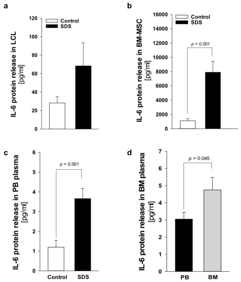 IL-6 release is elevated in SDS specimens compared to age-matched donor controls. (a) Measurement of IL-6 released in supernatants collected from 1 × 106 LCL after 48h. Data are mean ± SEM of 10 experiments conducted on LCL obtained from UPN24, UPN26, UPN58, UPN68, UPN75, and UPN106. (b) IL-6 released in supernatants collected from 2 × 105 primary BM-MSC after 48 h. (c) IL-6 concentration in peripheral blood (PB) plasma samples obtained from 21 patients with SDS (UPN1, 13, 26, 37, 47, 52, 56, 57, 58, 63, 65, 66, 69, 72, 73, 74, 87, 94, 104, 106, 108) compared with age-matched plasma controls. (d) IL-6 concentration in bone marrow (BM) plasma samples obtained from eight patients with SDS (UPN 47, 56, 65, 74, 87, 94, 106, 108) compared to PB plasma samples obtained from the same patients. Normal distribution was tested by the Shapiro–Wilk test. The Mann–Whitney Rank Sum Test was calculated and reported within histograms.