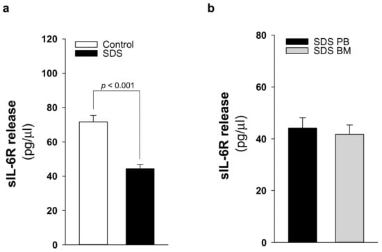 IL-6 signaling cascade occurs by classical activation through mbIL-6R or trans-signaling via the soluble sIL-6R [19]. The latter mechanism allows cells that do not express mbIL-6R, but do express gp130, to be responsive to IL-6. Undifferentiated MSC lack the expression of IL-6 receptor although they normally express gp130 [33]. Thus, trans-signaling should be required to activate these cells upon IL-6 stimulation. Nevertheless, BM-MSC can constitutively release large quantities of IL-6 [34]. In this work, we quantified sIL-6R in plasma samples obtained from 21 patients with SDS. In healthy individuals, plasma levels of sIL-6R range between 50–70 ng/mL [35]. Of note, we found that the soluble receptor release is reduced in SDS patients (44.3 ± 15.4 pg/μL) compared to age-matched healthy donors (71.6 ± 14.7 pg/μL) (Figure 6a). To verify whether the bone marrow compartment, which showed increased levels of IL-6, exhibits also higher levels of sIL-6R, we compared sIL-6R expression in peripheral blood plasma with the expression found in bone marrow plasma obtained in parallel from the same patients. However, peripheral blood and bone marrow plasma showed comparable levels of sIL-6R expression (Figure 6b).
