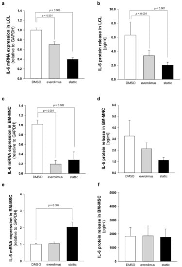 Everolimus and stattic inhibit IL-6 expression in SDS patient-derived hematopoietic cells. (a) IL-6 transcript expression in LCL incubated in the absence (DMSO) or in the presence of 350 nM everolimus or 7.5 μM stattic for 24 h was quantified by qRT-PCR. Data are mean ± SEM of six experiments performed in duplicate from three affected individuals (UPN58, UPN75, and UPN106). (b) IL-6 release in supernatants collected from LCL incubated in the absence (DMSO) or in the presence of 350 nM everolimus or 7.5 μM stattic for 24 h, as measured by Bio-plex assay. Data are mean ± SEM of six experiments conducted as reported in panel a. (c) IL-6 mRNA expression in primary BM-MNC incubated in the absence (DMSO) or in the presence of 350 nM everolimus or 7.5 μM stattic for 24 h was quantified by qRT-PCR. Data are mean ± SEM of four experiments performed in duplicate from four affected individuals (UPN74, UPN80, UPN94, and UPN106). (d) IL-6 release in supernatants collected from BM-MNC as measured by Bio-plex assay. Data are mean ± SEM of four experiments conducted as reported in panel c. (e) IL-6 transcript expression in BM-MSC incubated in the absence (DMSO) or in the presence of 350 nM everolimus or 7.5 μM stattic for 24 h was quantified by qRT-PCR. Data are mean ± SEM of four experiments performed in duplicate from four affected individuals (UPN33, UPN35, UPN67 and UPN91). (f) IL-6 release in supernatants collected from BM-MSC (UPN33, UPN35, UPN67 and UPN91) as measured by Bio-plex assay. Data are mean ± SEM of four experiments conducted as reported in panel e. Statistics: Normal distribution was tested by the Shapiro–Wilk test, and the Student’s t test for paired data has been calculated and reported within histograms, accordingly.