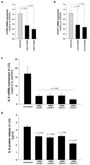 Total RNA from LCL and MNC was isolated using High Pure RNA Isolation Kit (Roche, Mannheim, Germany) following the manufacturer’s instructions. RNA was eluted in 50 µL of RNAse free water. Final RNA concentration was determined using NanoDrop 2000 spectrophotometer (Thermo Fisher Scientific, Foster City, CA, USA) and then stored at −80 °C until use. A total amount of 500 ng of RNA was reverse transcribed to cDNA using a High Capacity cDNA Reverse Transcription Kit with random primers (Applied Biosystems by Thermo Fisher Scientific) for 120 min at 37 °C and 5 min at 85 °C in a final reaction volume of 20 μL. For real-time qPCR analysis, 5 Μl of cDNA were used for each reaction to quantify the relative gene expression. The cDNA was then amplified for 45 PCR cycles using Platinum SYBR Green qPCR Super Mix-UDG (Invitrogen by Thermo Fisher Scientific) in a 20 μL reaction using the Rotor-Gene 6000 cycler (Qiagen, Hilden, Germany). In order to perform the PCR reaction, QuantiTect Primer Assays (Qiagen) for IL-6 (Hs_IL6_1_SG, NM_000600), STAT3 (Hs_STAT3_1_SG, NM_003150), mTOR (Hs_MTOR_1_SG, NM_004958), and GAPDH (HS_GAPDH_1_SG, NM_001256799) were purchased. Each target gene expression was normalized with GAPDH gene expression and relative quantification was calculated by the ΔCt method.