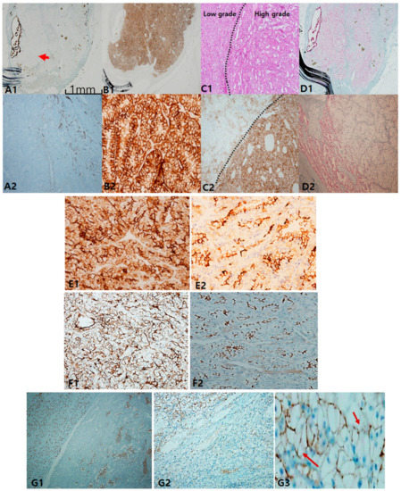 Classic immunopanels for clear-cell renal cell carcinoma (CCRCC). (A1,A2) cytokeratin 7 labeling is mostly negative but exceptionally positive in macrocystic tubules (arrow). (B1,B2) Carbonic anhydrase IX (CAIX) is always positive as a box pattern, which is a pathognomonic sign. (C1,C2) CAIX labeling tends to be stronger and more diffuse in higher grades (grade 3–4) than in lower ones (grade 1–2). (D1,D2) Alpha-methylacyl-CoA racemase is variably positive but less intense than in papillary renal cell carcinoma (PRCC). Adjuvant immunopanels of CCRCC. (E1,E2) In CCRCC, immunoreactivities of epithelial membrane antigen and CD10 are closely correlated. EMA is more exaggerated (E1) and CD10 expression occurs in a saw-tooth luminal pattern (E2). (F1,F2) EMA (F1) labeling recapitulates exaggerated CD10 (F2) expression. (G1–G3) E-cadherin expression is frequently lost (G1,G2) or occasionally broken (arrows) (G3). Scale bars = 1 mm.