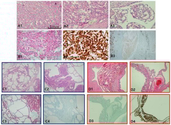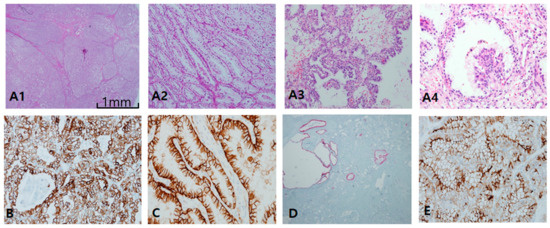 Clear-cell papillary renal cell carcinoma. (A1–A4) In clear-cell papillary RCC (CCPRCC), histological findings include multilobulated small masses (A1) entirely composed of well-differentiated simple tubular structures mimicking distal tubules (A2) with intraluminal tufts (A3) and short papillary fronds in a glomeruloid pattern (A4). (B–D) Immunohistochemical profiles. Cytokeratin 7 is diffusely and strongly positive (B), Carbonic anhydrase IX is positive with cup-shaped pattern, (C), Alpha-methylacyl-CoA racemase is generally negative except for macrocystic spaces (D), and CD10 as a saw-tooth luminal pattern (E). Scale bars = 1 mm.