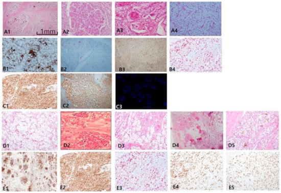 Microphthalmos translocation family RCC (MiT RCC). (A1–A4) In MiT RCC, characteristic findings include intracystic papillary masses composed of clear cells (A2) with psammoma bodies (A1) and fibrins (A3) and sometimes marked reverse polarity (A4). However, these findings are not specific to diagnose MiT RCC by histology alone. (B,C) When MiT RCC is suspected, adequate immunohistochemical panel should be applied, beginning with cathepsin K staining (C1). Conventional markers such as CK7 (not shown), epithelial membrane antigen (B1), alpha-methylacyl-CoA racemase (B2), and carbonic anhydrase IX (not shown) are generally negative, while HMB45 (B3) and melan A (B4) are occasionally positive. A more definitive diagnosis can be made with transcription factor E3 (C2) or fluorescent in situ hybridization break-apart signals (C3). (D1–D5) The characteristic findings transcription factor EB (TFEB)-related MiT RCC include nested fluoret sign (D1,D2), ballooning clear cells (D3), stromal hyalinization, fibrinous occlusive blood vessels with extensive peliosis-like changes (D4), and melanin pigment deposit in tumor cells (D5). (E1–E4) Immunohistochemical profiles. TFEB (E1,E2), cathepsin K (E3), HMB45 (E4), paired box gene 8 (E5) are specifically positive. Scale bars = 1 mm.