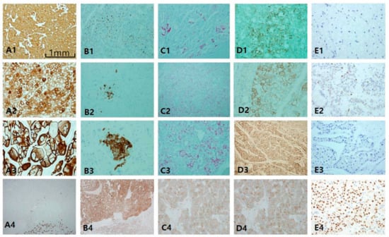 Comparison of chromophobe renal cell carcinoma (ChRCC) with renal oncocytoma (RO). Differential diagnosis between these entities is difficult since they overlap in origin and morphology. (A1–A4) cytokeratin 7 is highly intense and diffusely stained in ChRCC in contrast to RO showing perfect negativity. (B1–B3) CD10 is generally negative, but focally patch positive, which is ignored. (C1–C3) Alpha-methylacyl-CoA racemase is negative or patch positive. Epithelial membrane antigen (B4) and E-cadherin (C4) are diffusely positive both in ChRCC and RO. (D1–D4) c-kit staining is basically positive in both entities. (E1–E4) Hepatocyte nuclear factor-1β (HNF1β) staining is a highly useful immunomarker to rule out the possibility of ChRCC. Scale bars = 1 mm.