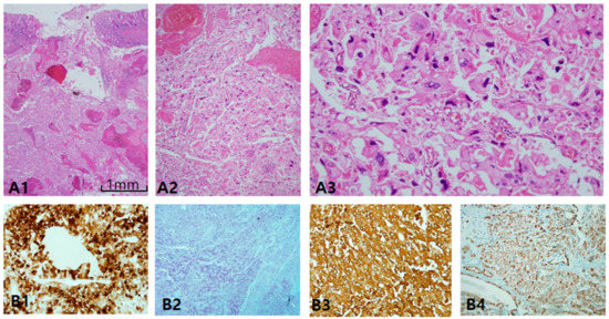 ChRCC is primarily characterized by CK7 positivity or being generally diffuse (Figure 6A1,A3) or occasionally patchy (Figure 6A2). CK7-negative tumors are less likely to be ChRCC. EMA is, however, diffusely positive in both tumors (Figure 6B4), whereas CD10 is mostly negative (Figure 6B1), with exceptional focal positivity (Figure 6B2,B3). AMACR is also negative (Figure 6C1) or focally positive (Figure 6C2,C3). E-cadherin is well preserved, never showing loss or broken patterns in both tumors (Figure 6C4). CAIX is completely negative (figure not shown). c-kit labeling is almost always diffuse and strong in both ChRCC (Figure 6D1–D3) and RO (Figure 6D4), but this is not pathognomonic since major parts of renal oncocytoma (RO) are also strongly c-kit-positive. Nearly all ChRCC showed almost total loss of HNF1β as a pathognomonic sign (Figure 6E1,E3) in spite of partial loss (Figure 6E2) as opposed to RO, which showed a totally positive reaction (Figure 6E4). In the present study, ChRCC demonstrated total loss of HNF1β (24/30–80%), but partial loss in 20%, while no mimickers including oncocytoma demonstrated HNF1β loss. In contrast, CK7-/c-kit+/HNF-1β+ staining can suggest oncocytoma. In the case of hybrid tumors with oncocytoma and ChRCC or undetermined cases with overlapping features of ChRCC and renal oncocytoma, triple immunomarkers are very useful. When any tumor demonstrates a CK7 patch positive/c-kit positive/ HNF-1β totally negative result, this favors ChRCC over RO. We optimized the cut-off value of HNF-1β as a positive rate over 50% of total nuclei, since all cases compatible with ChRCC never exceed the positive rate of HNF-1β over 50%. We have another two collections of ChRCC that were proven to be very aggressive and have a fatal course, metastasizing (Figure 7A1) and even causing death within 1 year. Both cases revealed focal spindling features (Figure 7A2) and marked anaplasia (International Society of Urological Pathology nucleolar grade 4) (Figure 7A3). Notably, CD10 (Figure 7B1) and AMACR (Figure 7B2) were aberrantly overexpressed in both aggressive cases, while CK 7 (Figure 7B3) and c-kit (Figure 7B4) maintained expression.