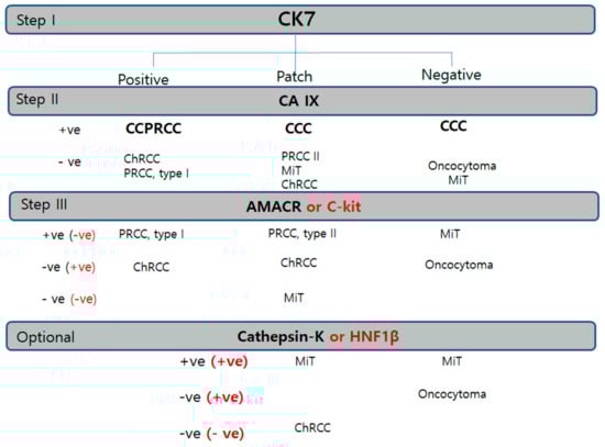For more efficient and reproducible optimal immunopanels, we proposed two-step panels of a canonical triple panel, CK7/AMACR/CAIX and adjunctive panel in equivocal cases (Figure 8).