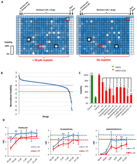 Here, using synthetic lethality screening, we detected and validated three FDA-approved drugs, Tranilast, Telmisartan, and Amphotericin B, which promote Pt-mediated death in ovarian cancer cells, whose resistance to cisplatin relies on ATP7B in a significant manner. All three drugs enhanced cisplatin toxicity via stimulation of Pt-DNA adduct formation. Notably, the efficacy of Tranilast and Telmisartan was confirmed in another cisplatin-resistant ovarian cancer cell line, A2870-CP20. However, these drug hits did not enhance cisplatin toxicity in the parental Pt-sensitive IGROV cells supporting the notion that resistant cells develop specific tolerance mechanisms [1,2] that might be targeted in a selective way.