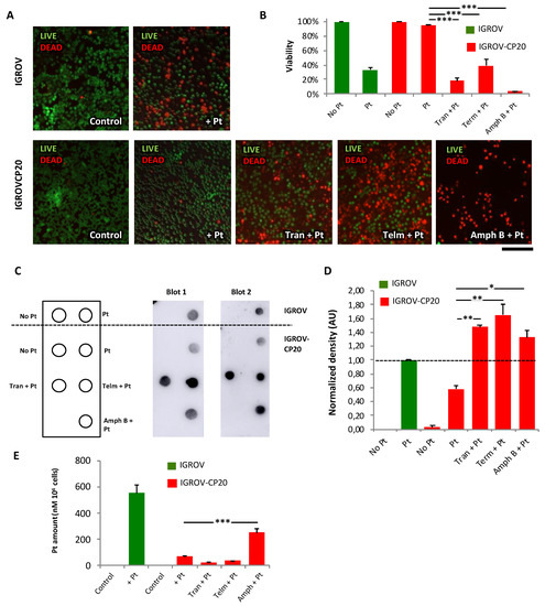 Several assays were employed to validate the efficacy of each HTS hit. Selective live/dead cell staining showed that the toxicity of cisplatin for IGROV-CP20 cells was very limited (Figure 3A,B). However, the level of cell mortality substantially increased when cisplatin treatment was supplemented with Tranilast, Telmisartant, or Amphotericin B (Figure 3A,B). The ability of the drug hits to promote cisplatin toxicity was also confirmed on the other ATP7B-mediated resistant tumor cell line A2780-CP20 (Figure S4A–C). However, Amphotericin B appeared to be quite toxic even alone in this cell type. Notably, none of the drugs were able to further increase Pt-mediated death in Pt-sensitive IGROV cells (Figure S4D).