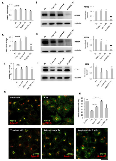 Impact of drug hits on expression of copper transporters and Pt-mediated trafficking of ATP7B in IGROV-CP20 cells. (A–F) IGROV-CP20 cells were treated with 10 µM Tranilast, Telmisartan, or Amphotericin B for 24 h and then 50 µM cisplatin was added for 24 h. The cells were then prepared for qRT-PCR (A,C,E) or Western blot ((B,D,F); see also signal density quantification in each panel) to evaluate the expression of ATP7B (A,B), ATP7A (C,D), and CTR1 (E,F) (for each qRT-PCR and blot n = 3 experiments; * p < 0.05, ** p < 0.01, ANOVA). (G,H) The cells were treated with 10 µM Tranilast, Telmisartan, or Amphotericin B for 24 h and then exposed to 50 µM cisplatin for 4 h to activate ATP7B trafficking. Confocal images (G) show that the drugs promote ATP7B retention in the Golgi (labeled with Golgin-97) upon cisplatin treatment as also revealed by quantification of the ATP7B signal (H) in the Golgi region (n = 10 fields; ** p < 0.01, *** p < 0.001, ANOVA). Scale bar: 15 µm (G).