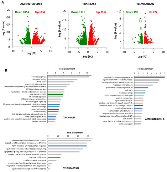 Impact of FDA-approved drugs on the transcriptome in cisplatin-treated IGROV-CP20 cells. (A) IGROV-CP20 cells were exposed for 24 h to 50 µM cisplatin either directly or 24 h after pretreatment with 10 µM Tranilast, Telmisartan, or Amphotericin B and prepared for QuantSeq analysis of mRNA (see Section 4). Volcano plot diagrams show down- and upregulated genes in IGROV-CP20 cells treated with the combination of the indicated drug and cisplatin compared to cisplatin alone. Data are expressed as Log of mRNA fold change. (B) The diagrams show GO enrichment analysis of genes whose expression was downregulated by Tranilast, Telmisartan, or Amphotericin B in cisplatin-treated cells. Pt-resistance pathways in common between at least two drugs are depicted with similar colors: DNA repair (green); protein quality control (blue); macroautophagy (cyan) and NFKB signaling (pink). Specific enrichment in downregulated copper ion binding genes (red bar) was detected only in Tranilast-treated cells.