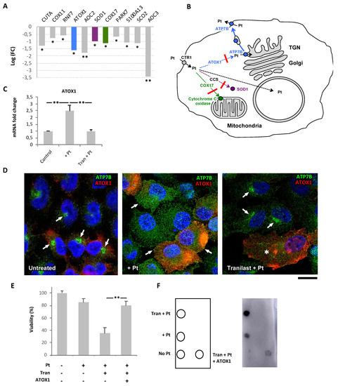Importantly, Tranilast-treated samples displayed a significant downregulation of genes encoding copper ion-binding proteins (Figure 5B). This cohort of genes comprised ATOX1, COX17, and SOD1 (Figure 6A), which are involved in copper and platinum distribution towards different cellular destinations such as the secretory system, mitochondria, and free radical detoxification pathways, respectively [31,32,33]. Thus, by affecting ATOX1, COX17, and SOD1, Tranilast might inhibit delivery of Pt to these pathways, thereby favoring its transport to the nucleus, where Pt promotes DNA damage resulting in cell death (Figure 6B).