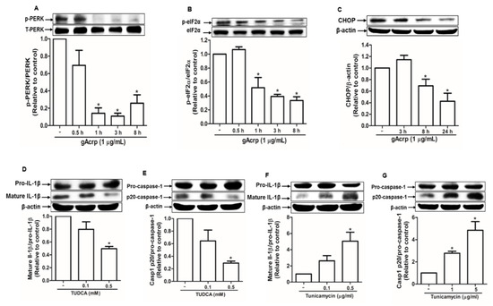 ER stress, which is usually upregulated in cancer cells, contributes to inflammasome activation [38]. To investigate the mechanisms underlying inhibition of inflammasome activation by gAcrp, we assessed the effect of gAcrp on ER stress and its potential role in the modulation of inflammasomes activation. As shown in Figure 2, gAcrp inhibited the protein kinase RNA-like endoplasmic reticulum kinase (PERK) arm of the unfolded protein response in ER stress signaling cascade in MCF-7 cells. In particular, gAcrp treatment significantly reduced the phosphorylation of PERK (Figure 2A) and its downstream kinase, eIF2α (Figure 2B), in a time-dependent manner. Moreover, the expression level of CHOP was decreased by treatment with gAcrp (Figure 2C). To further understand the role of ER stress regulation in gAcrp-inhibition of inflammasome activation, we evaluated the effects of ER stress modulators on IL-1β maturation and caspase-1 activation in MCF-7 cells. Tauroursodeoxycholic acid (TUDCA), a classical inhibitor of ER stress, significantly reduced the levels of mature IL-1β (Figure 2D) and active subunit of caspase-1 (p20) (Figure 2E) in a dose-dependent manner. On the contrary, tunicamycin, a pharmacological ER stress inducer, induced significant increases in mature IL-1β and active caspase-1 in MCF-7 cells (Figure 2F,G). Collectively, these results suggest that ER stress contributes to inflammasomes activation and that alleviation of ER stress would be a potential mechanism for suppression of inflammasomes activation by gAcrp in breast cancer cells.
