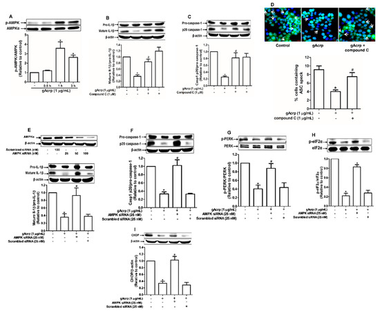 AMPK acts as a master sensor of various biological responses induced by adiponectin. To further clarify the mechanisms involved in inflammasomes inhibition, we examined whether AMPK mediates the inhibitory effects of gAcrp on inflammasomes and ER stress. Treatment with gAcrp induced phosphorylation of AMPK in MCF-7 cells (Figure 3A), consistent with previous reports. Notably, inhibition of AMPK signaling by either a pharmacological inhibitor (compound C) (Figure 3B,C) or gene silencing of AMPKα (Figure 3E,F) led to restoration of mature IL-1β and caspase-1 levels in gAcrp-treated MCF-7 cells. Compound C also abrogated the inhibitory effect of gAcrp on ASC speck formation (Figure 3D). Given that relief of ER stress is involved in the regulation of inflammasomes by gAcrp, we further investigated contribution of AMPK signaling in inhibition of ER stress. As expected, transfection with a siRNA targeting AMPKα restored the phosphorylation of PERK (Figure 3G) and eIF2α (Figure 3H), and the expression level of CHOP (Figure 3I) in MCF-7 cells treated with gAcrp. Taken together, these findings support the notion that AMPK signaling plays a key role in the regulation of ER stress and inflammasomes by gAcrp.